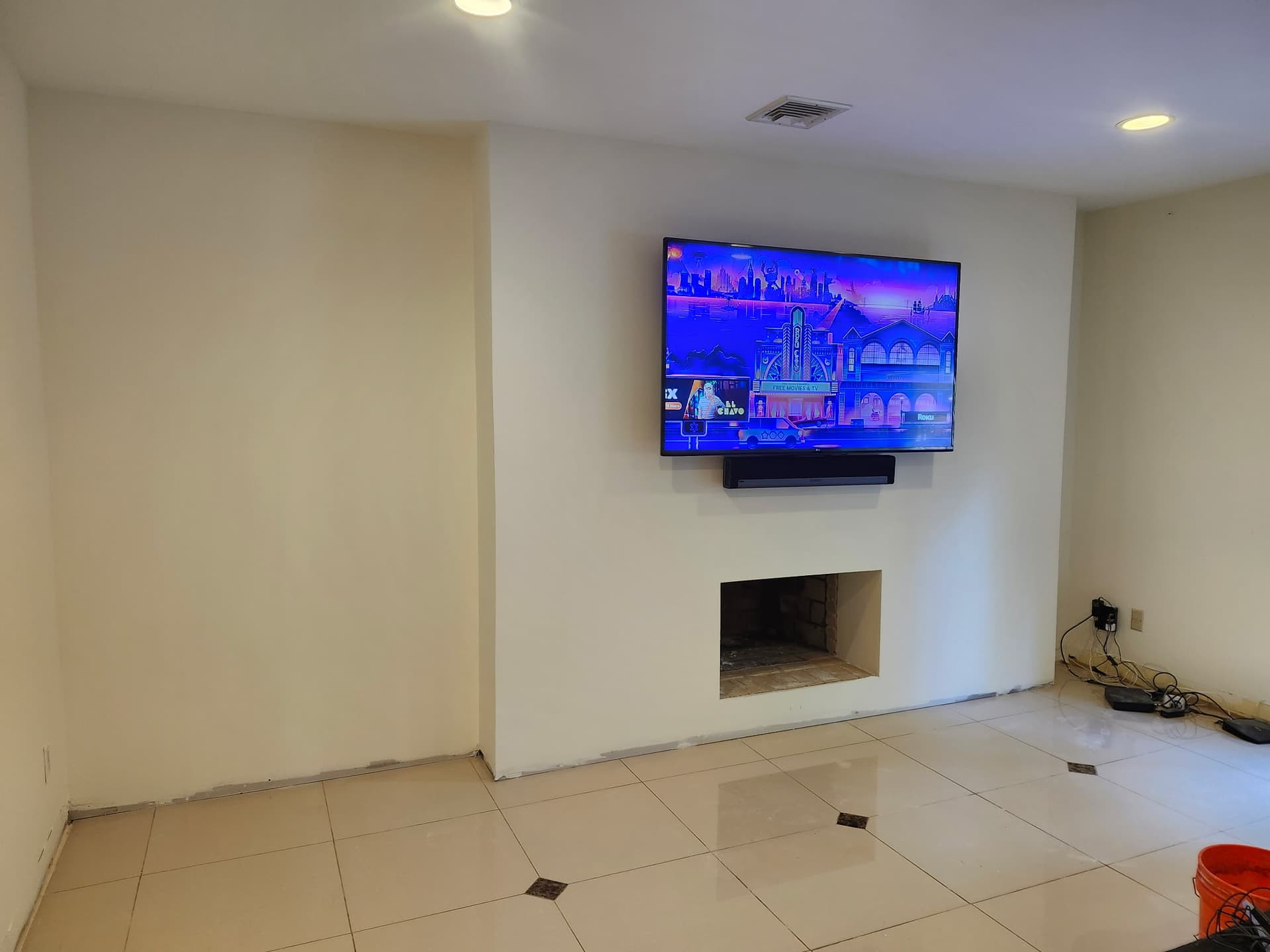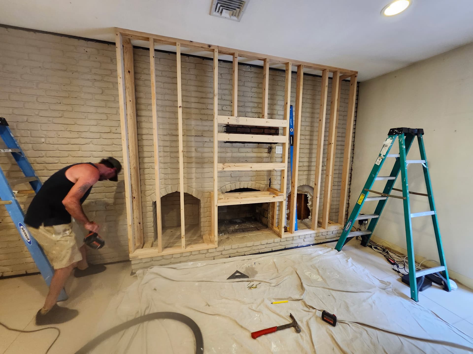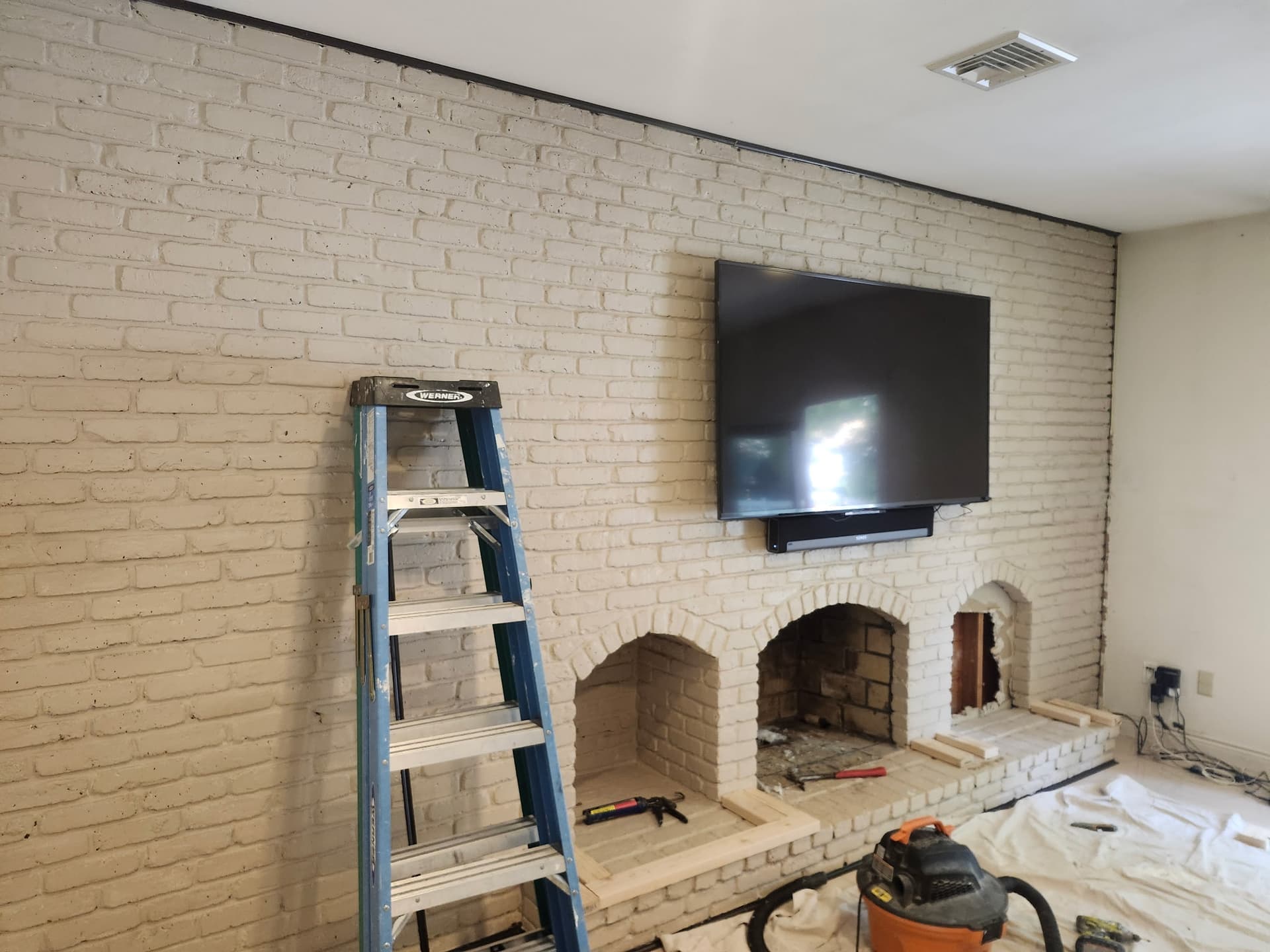 The homeowner wanted a new wall in front of his brick fireplace while preserving access to the fireplace. We framed the new wall, drywalled, painted, taped and spacked, and mounted the TV.